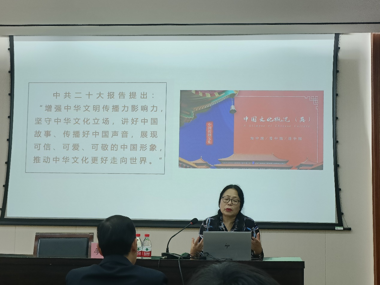 廖教授以自主开发的国家一流课程《中国文化概况》(英语)为例,从课程概述、理念与目标、建设历程、学情分析、课程痛点及课程育人体系设计六个方面展开了深入浅出、细致全面地讲解和论述。通过自身20多年在课程建设方面“自主建构、迭代升级、‘赋’能育人”的经验分享,诠释了如何打造金专、金课、金师及金教材。