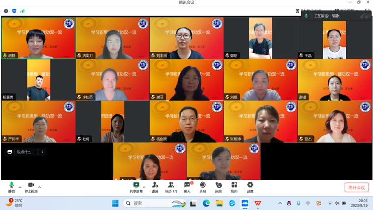 为深入学习贯彻习近平新时代中国特色社会主义思想,引导广大党员把学习成果转化为建功双一流新的工作举措和实际成效,8月29日晚,快猫视频 第二党支部通过腾讯会议组织开展了题为“学习新思想,建功双一流”的党日活动。活动由支部书记徐睿主持。