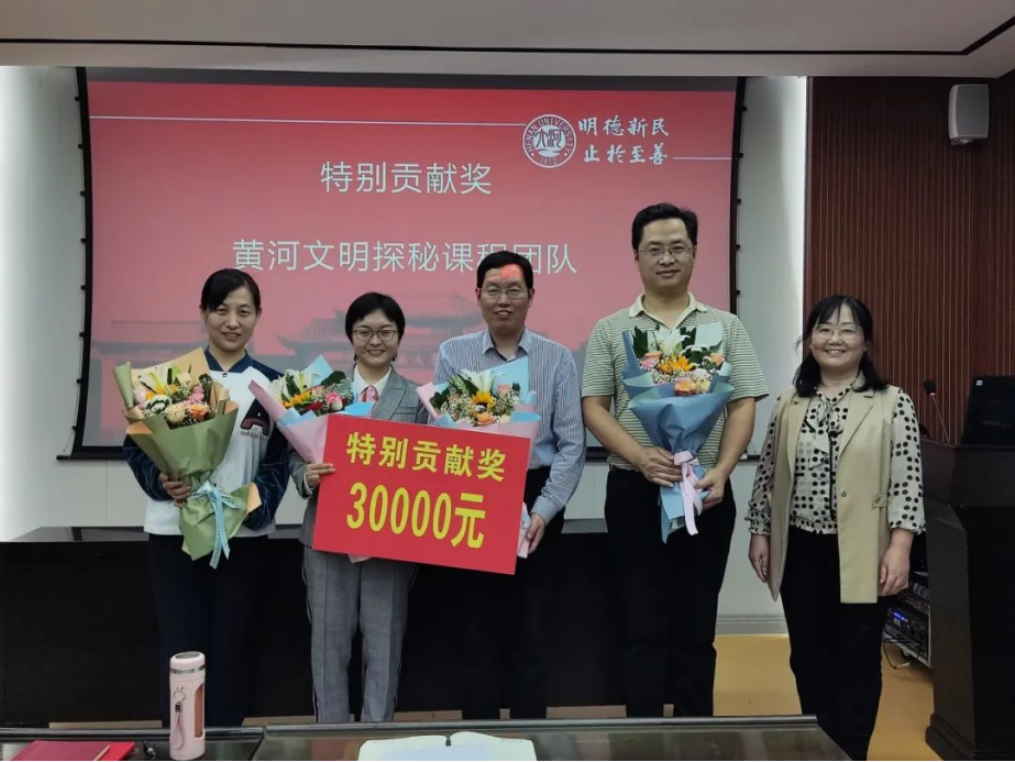 按既定议程,首先对从事教育工作满30年的谢菲和徐睿两位教师进行了表彰。接下来对3组获得国家级各类教学竞赛奖励和6组获得省级各类教学竞赛奖励的团队和个人进行了表彰。最后表彰的是特别贡献奖,今年4月,黄河文明探秘课程获批国家级一流本科课程,实现了快猫视频 国家级课程的突破,单位对其团队的特殊贡献予以重奖。