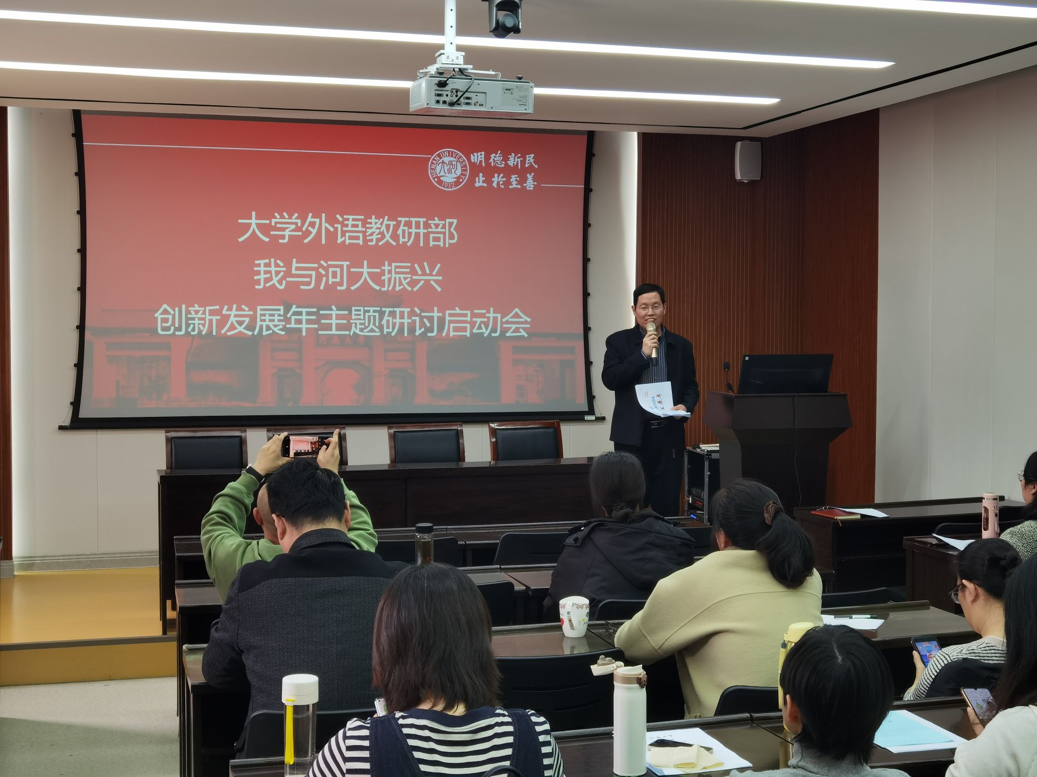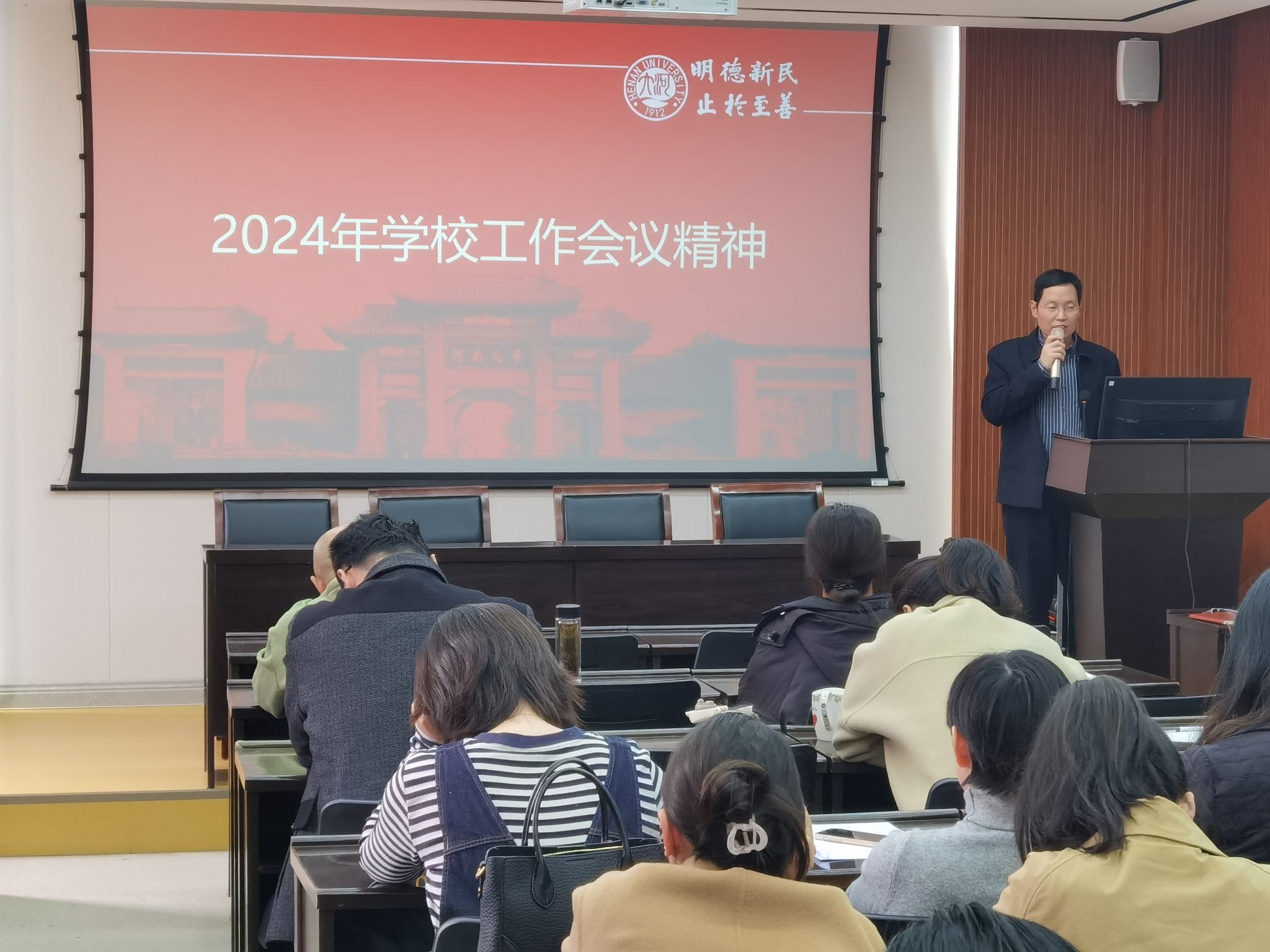 3月28日下午,快猫视频 在大会议室召开全体教职工会议,学习习近平总书记重要讲话精神和全国两会精神,学习贯彻落实2024年学校工作会议精神,启动“我与河大振兴”创新发展年主题研讨活动。部党委书记、主任杨剑波主持会议。