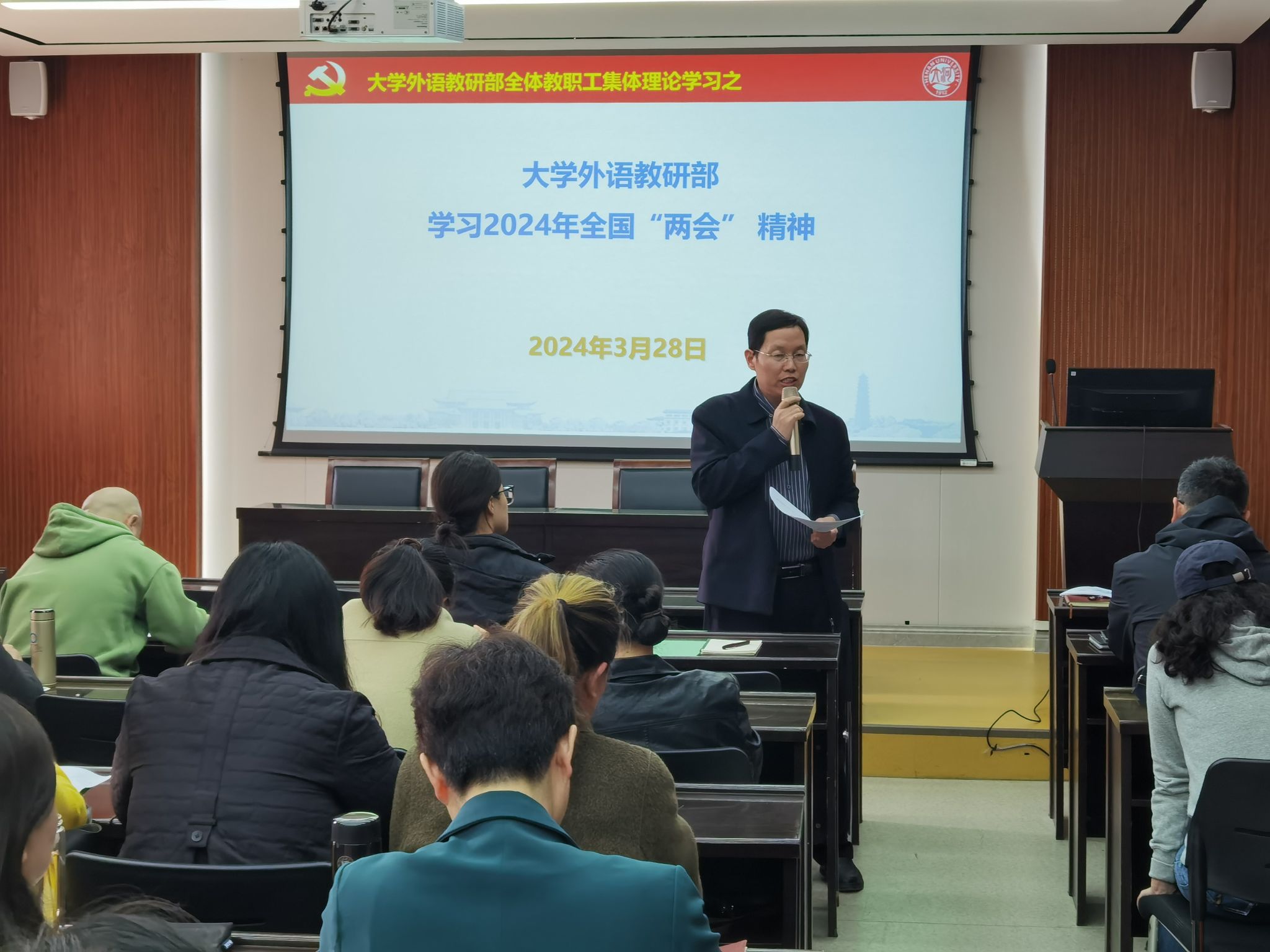 会议共分为三部分,按既定议程,首先由部党委副书记、副主任蒋框领学习近平总书记重要讲话精神和全国两会精神。蒋框为全体教师解读了会议概况、习近平总书记在全国两会期间重要讲话精神,结合大学英语教学梳理了什么是新质生产力、为什么强调新质生产力、怎样发展新质生产力。