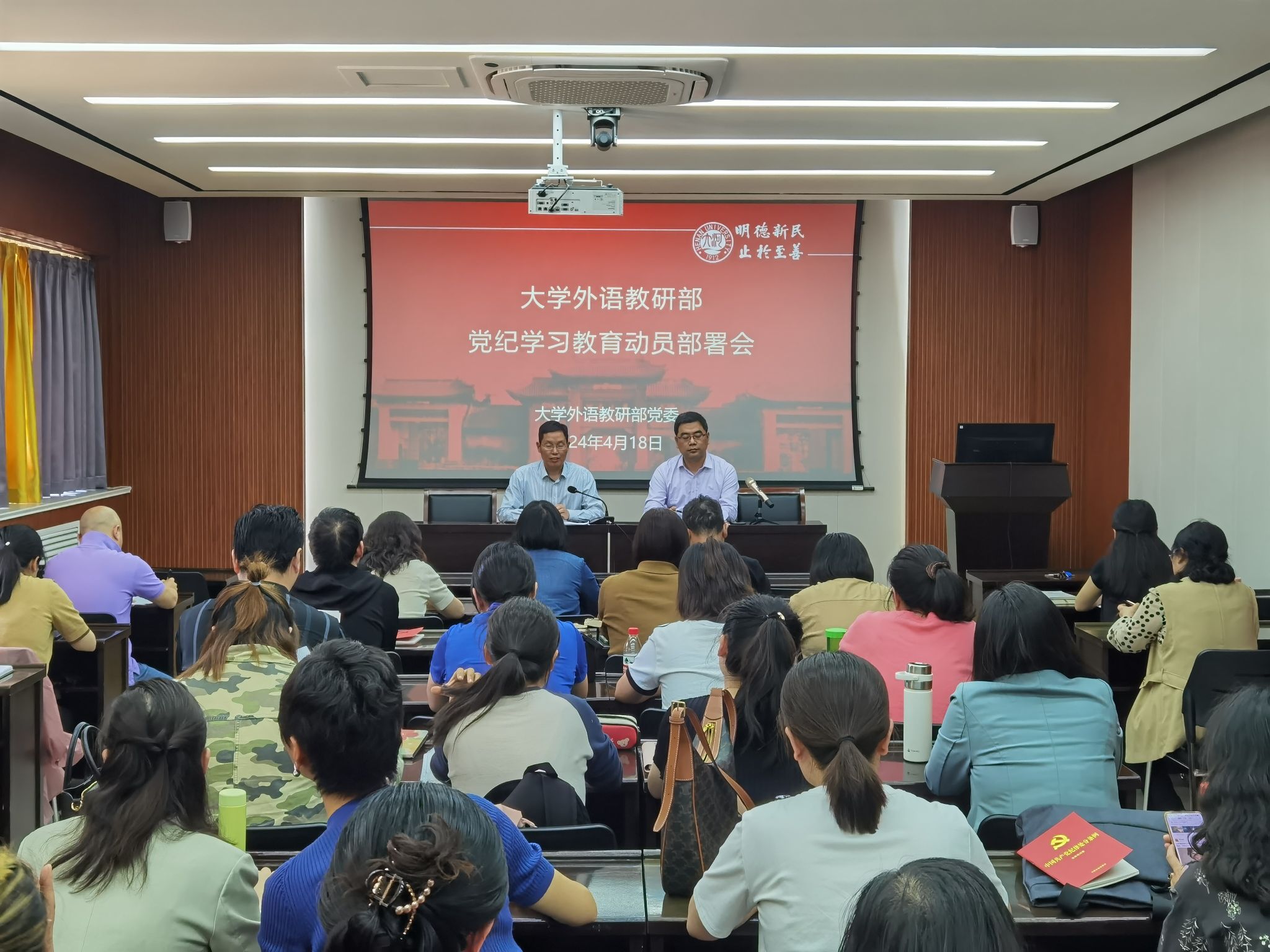 按照既定议程,杨剑波介绍了我校党纪学习教育动员暨2024年深化全面从严治党工作会议的主要内容,领学了校党委《关于在全校党员中开展党纪学习教育的工作方案》,传达了校领导在会议上的讲话精神。随后,部党委副书记、副主任蒋框详细汇报了《大学外语教研部党纪学习教育工作方案》和学习计划。