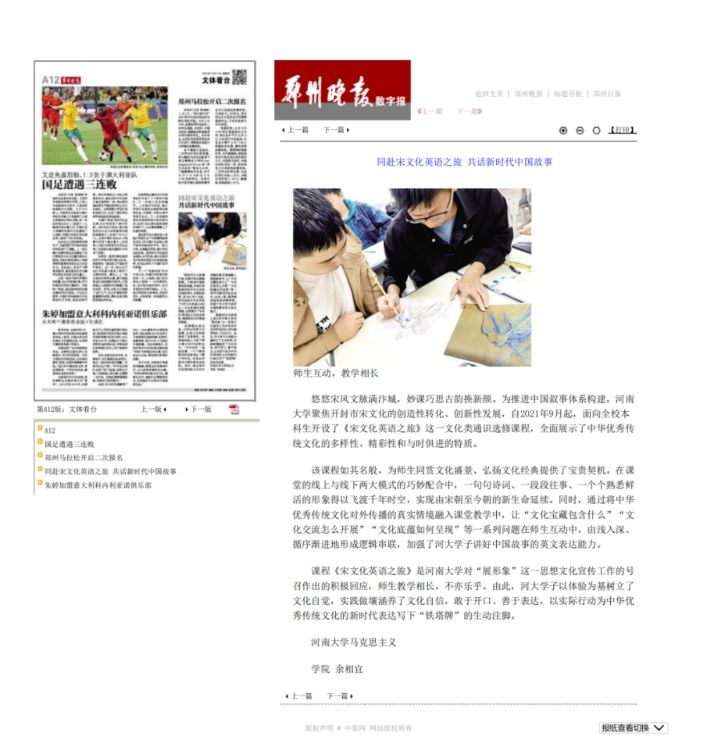 近日,这一课程因其独特的教学理念和实践成果,荣登郑州晚报,成为课程扩大社会影响力的一大亮点,更是对快猫视频 在文化传承与国际化人才培养方面所做努力的高度评价。