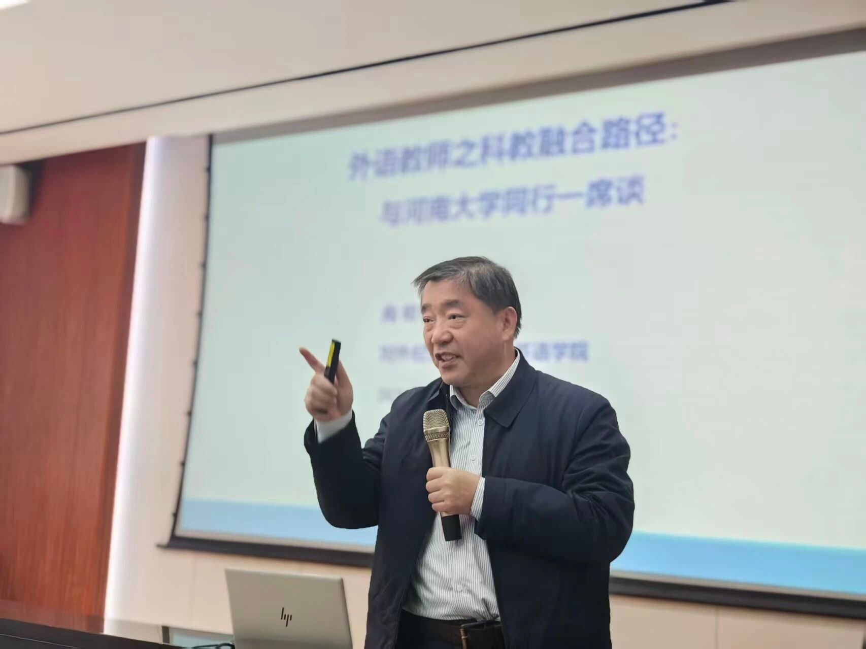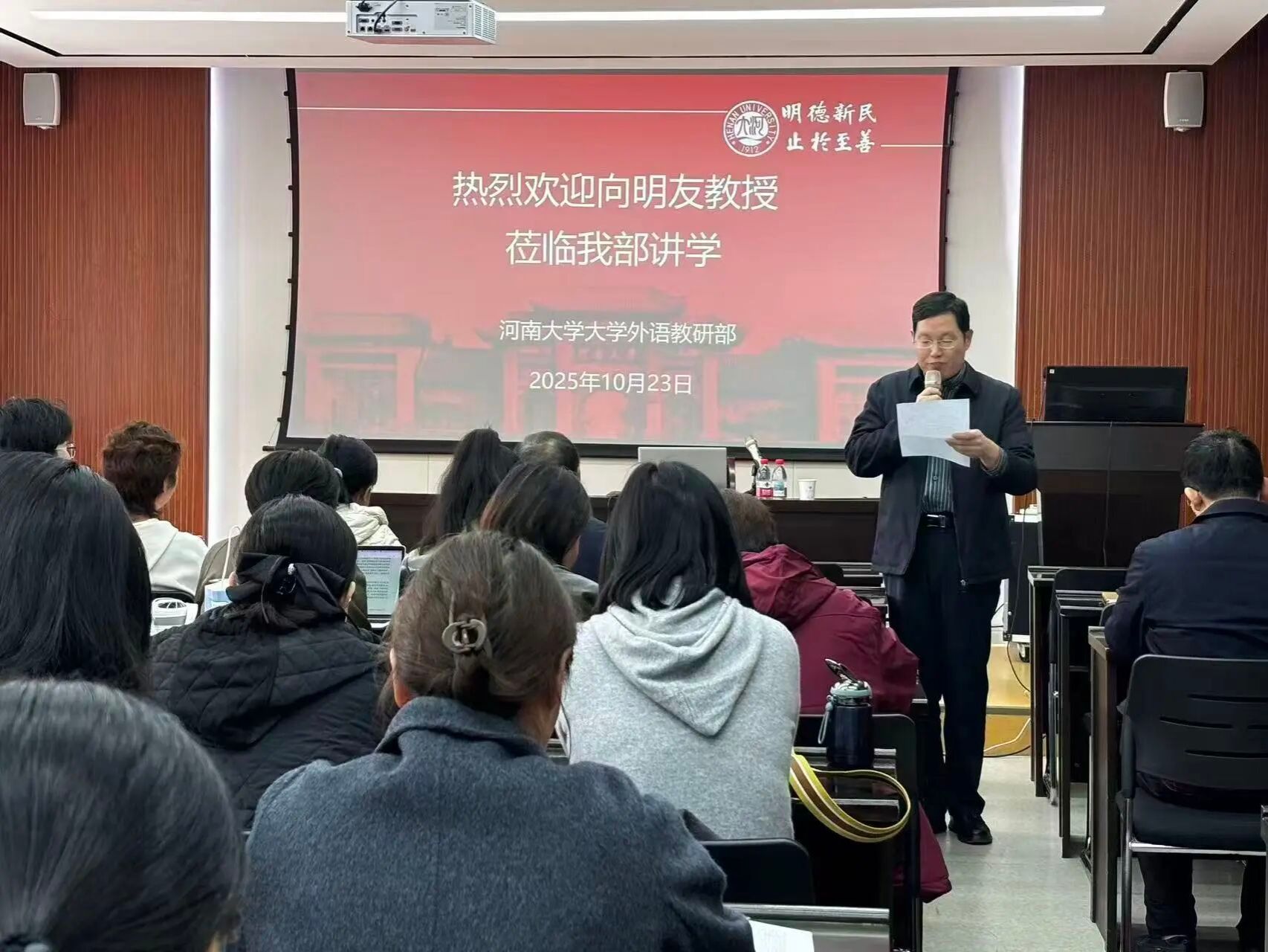 2025年10月23日,对外经济贸易大学向明友教授应快猫视频 之邀,做客“大学英语名家讲坛”,做了题为“外语教师之科教融合路径”的学术讲座。讲座在快猫视频 一楼大会议室举行,由部党委书记、主任杨剑波主持。